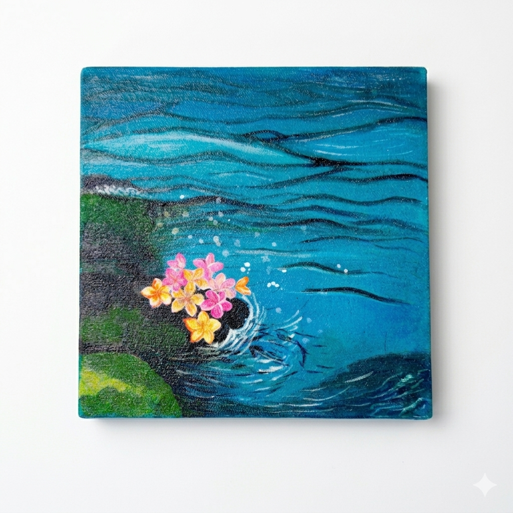 বর্গাকার ক্যানভাস: নীল জলরাশি ও শাপলা নীল রঙের আধিপত্য থাকা একটি জলজ দৃশ্য। বিষয়বস্তু: সমুদ্র বা জলাশয়ের নীল পানির ওপর কিছু রঙিন ফুল ভেসে আছে। রঙ: উজ্জ্বল নীল ও সবুজ রঙের ব্যবহার ছবিটিকে প্রাণবন্ত করে তুলেছে।